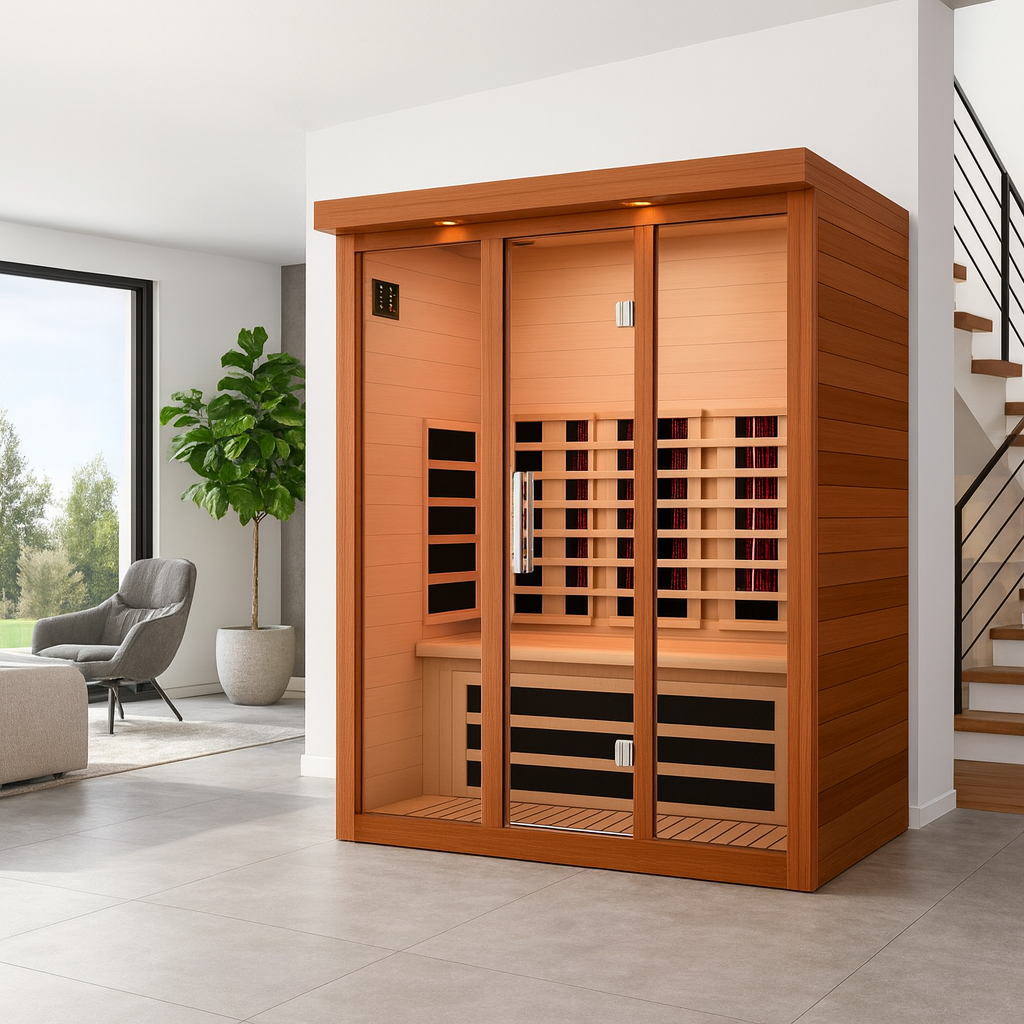 This infrared sauna is designed for indoor use only. It should be installed in a dry, enclosed space that’s protected from moisture, rain, and direct sunlight to maintain the wood's integrity and performance. Placing it in a semi-outdoor area—like a covered porch—is not recommended, as exposure to outdoor conditions may damage the unit over time.